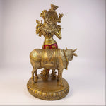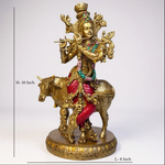 Embrace divine harmony with this harmonious polyresin Krishna with cow statue, a captivating addition to your spiritual decor. Crafted from durable polyresin, this handcrafted Hindu god idol depicts Lord Krishna playing his flute, with a cow standing gracefully in the background, adorned with intricate gold, green, and blue detailing. Perfect for pooja rooms, living spaces, or as a meaningful gift, it brings love, protection, and pastoral peace to your home.