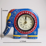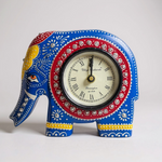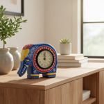 A stunning elephant-shaped clock crafted in wood and hand painted with traditional Rajasthani patterns. Its vibrant shades and embedded crystal accents make it a standout wall or shelf accessory.