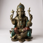 bejeweled Bring home the divine blessings of Lord Ganesha with this beautifully crafted polyresin Ganpati idol. Designed with intricate detailing, this statue shows Lord Ganesha seated gracefully on a lotus flower, symbolizing purity, wisdom, and prosperity.