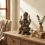 Hand-painted with rich golden, red, and green tones, every detail from the bejeweled crown to the modak in His hand reflects traditional artistry and devotion. This idol not only enhances the spiritual ambiance of your home temple but also serves as a stunning decor piece for your living room, office, or study.