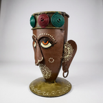 A distinctive tribal-style pen stand handcrafted in metal, featuring expressive detailing and vibrant colour work. Perfect for elevating your study/office table aesthetics.